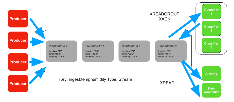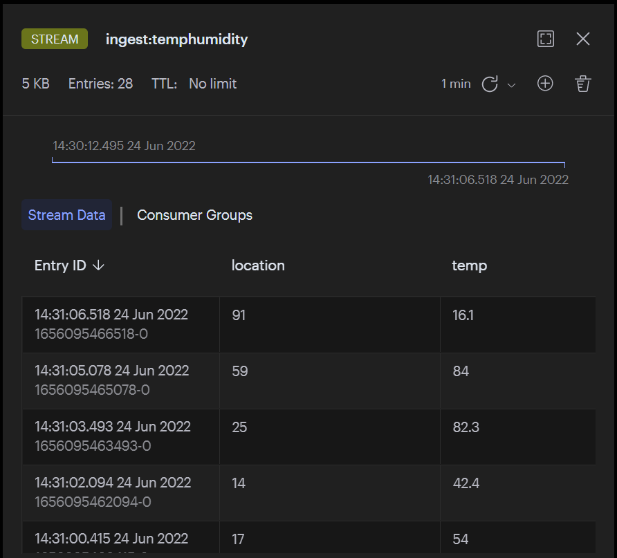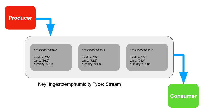 [ 'location', '96', 'temp', '15.4', 'humidity', '70' ]The consumer stores the last entry ID that it read in a Redis string at the key consumer:lastid. It uses this string to pick up from where it left off after it is restarted. Try this out by stopping it with Ctrl+C and restarting it.